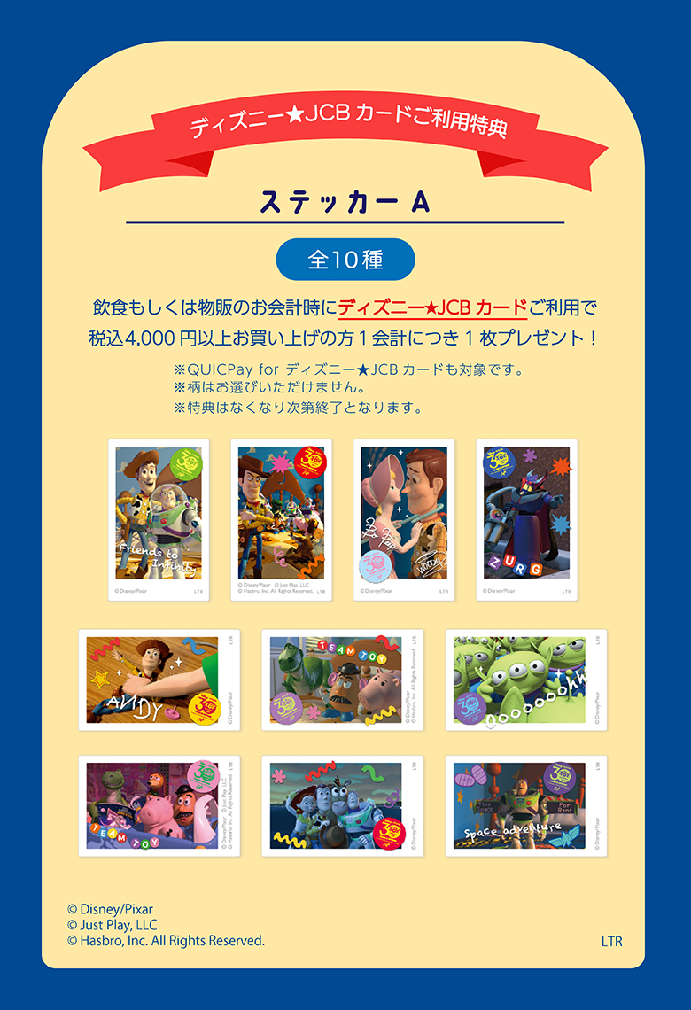 ディズニー★JCBカードを1会計につき税込4,000円以上ご利用いただいた方に先着で「ステッカーA(全10種)」をランダムで1枚プレゼント!